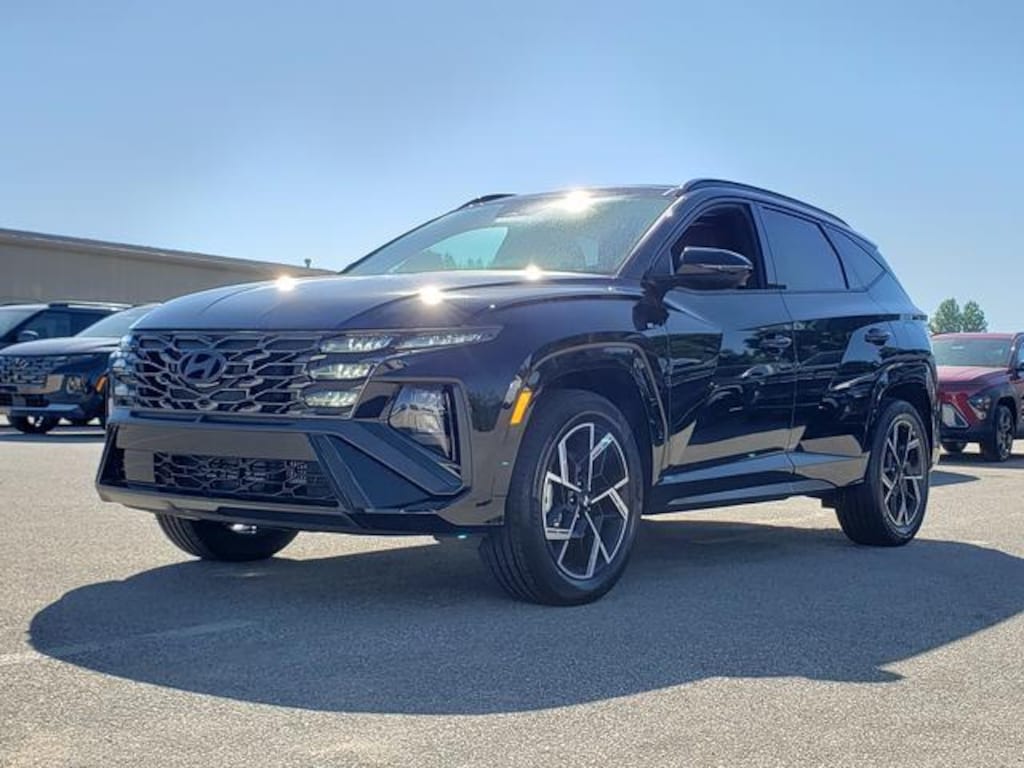 Check out all these great options Option Group 01, Tow & Go Package (Ball Mount Kit and Tow Hitch), 4-Wheel Disc Brakes, 8 Speakers, ABS brakes, Air Conditioning, Alloy wheels, AM/FM radio: SiriusXM, Apple CarPlay & Android Auto, Auto High-beam Headlights, Auto-dimming Rear-View mirror, Automatic temperature control, Brake assist, Bumpers: body-color, Cargo Cover, Carpeted Floor Mats, Delay-off headlights, Driver door bin, Driver vanity mirror, Dual front impact airbags, Dual front side impact airbags, Electronic Stability Control, Emergency communication system: Bluelink+, First Aid Kit, Four wheel independent suspension, Front anti-roll bar, Front Bucket Seats, Front Center Armrest, Front dual zone A/C, Front reading lights, Fully automatic headlights, Heated door mirrors, Heated Front Bucket Seats, Heated front seats, Illuminated entry, Leather steering wheel, Low tire pressure warning, Navigation System, Occupant sensing airbag, Outside temperature display, Overhead airbag, Overhead console, Panic alarm, Passenger door bin, Passenger vanity mirror, Power door mirrors, Power driver seat, Power Liftgate, Power moonroof, Power steering, Power windows, Radio data system, Radio: Bose Premium w/AM/FM/HD Audio System, Rear anti-roll bar, Rear reading lights, Rear seat center armrest, Rear side impact airbag, Rear window defroster, Rear window wiper, Remote keyless entry, Security system, Speed control, Split folding rear seat, Spoiler, Sport Combination Seat Trim, Steering wheel mounted audio controls, Tachometer, Telescoping steering wheel, Tilt steering wheel, Traction control, Trip computer, Turn signal indicator mirrors, Variably intermittent wipers, and Wheels: 19" Unique N-Line. Ash Black 2025 Hyundai Tucson Hybrid N Line AWD 6-Speed Automatic 1.6L I4 DGI Hybrid Turbocharged DOHC 16V LEV3-SULEV30