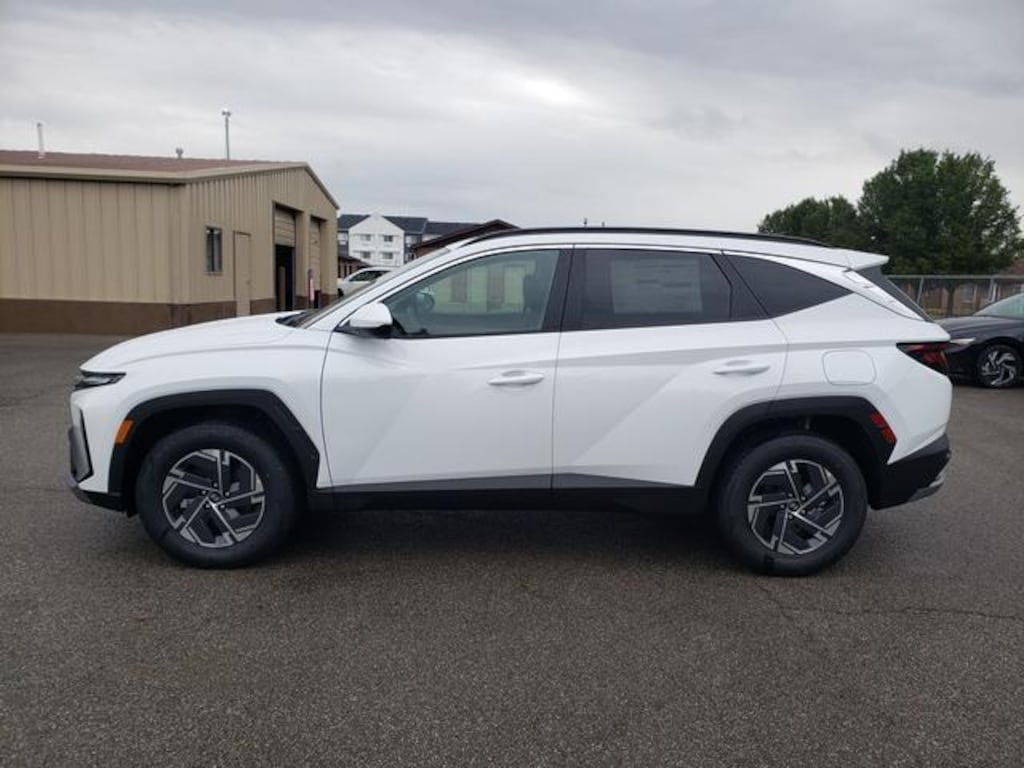 Check out all these great options Option Group 01, 17" Alloy Wheels, 4-Wheel Disc Brakes, 6 Speakers, ABS brakes, Air Conditioning, Alloy wheels, AM/FM radio: SiriusXM, Apple CarPlay & Android Auto, Auto High-beam Headlights, Automatic temperature control, Brake assist, Bumpers: body-color, Cargo Cover, Cargo Net, Cargo Tray, Carpeted Floor Mats, Delay-off headlights, Driver door bin, Driver vanity mirror, Dual front impact airbags, Dual front side impact airbags, Electronic Stability Control, Emergency communication system: Bluelink+, First Aid Kit, Four wheel independent suspension, Front anti-roll bar, Front Bucket Seats, Front Center Armrest, Front dual zone A/C, Front reading lights, Fully automatic headlights, Heated door mirrors, Heated Front Bucket Seats, Heated front seats, Illuminated entry, Low tire pressure warning, Occupant sensing airbag, Outside temperature display, Overhead airbag, Overhead console, Panic alarm, Passenger door bin, Passenger vanity mirror, Power door mirrors, Power driver seat, Power Liftgate, Power steering, Power windows, Radio data system, Radio: AM/FM/HD Audio System, Rear anti-roll bar, Rear reading lights, Rear seat center armrest, Rear side impact airbag, Rear window defroster, Rear window wiper, Remote keyless entry, Security system, Speed control, Split folding rear seat, Spoiler, Stain & Odor Resistant Cloth Seat Trim, Steering wheel mounted audio controls, Tachometer, Telescoping steering wheel, Tilt steering wheel, Traction control, Trip computer, and Variably intermittent wipers. Creamy White Pearl 2025 Hyundai Tucson Hybrid Blue AWD 6-Speed Automatic 1.6L I4 DGI Hybrid Turbocharged DOHC 16V LEV3-SULEV30