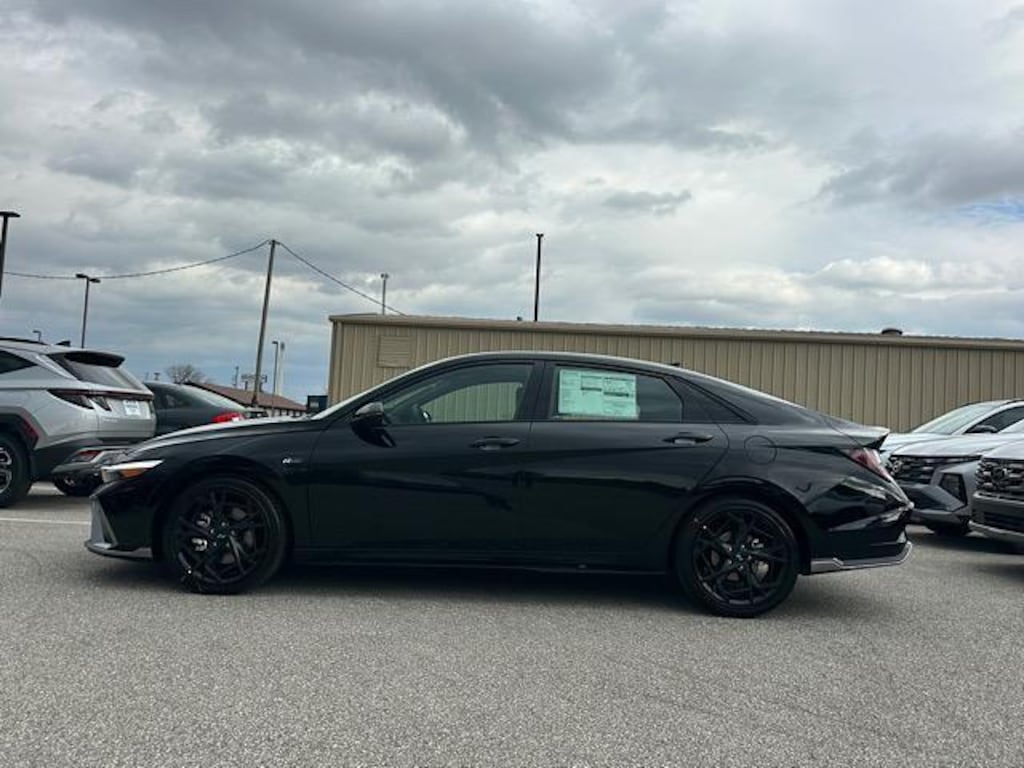 Check out all these great options Option Group 01, 18" x 7.5J Alloy Wheels, 4-Wheel Disc Brakes, 8 Speakers, ABS brakes, Air Conditioning, All-Season Fitted Liners, Alloy wheels, AM/FM radio: SiriusXM, Apple CarPlay & Android Auto, Auto High-beam Headlights, Automatic temperature control, Brake assist, Bumpers: body-color, Cargo Tray, Carpeted Floor Mats, Combination Cloth and Leatherette Seating Surfaces, Delay-off headlights, Driver door bin, Driver vanity mirror, Dual front impact airbags, Dual front side impact airbags, Electronic Stability Control, Emergency communication system: None, Exterior Parking Camera Rear, First Aid Kit, Four wheel independent suspension, Front anti-roll bar, Front Bucket Seats, Front Center Armrest, Front dual zone A/C, Front reading lights, Fully automatic headlights, Heated door mirrors, Heated front seats, Heated Front Sport Bucket Seats, Illuminated entry, Leather Shift Knob, Leather steering wheel, Low tire pressure warning, Navigation System, Occupant sensing airbag, Outside temperature display, Overhead airbag, Overhead console, Panic alarm, Passenger door bin, Passenger vanity mirror, Power door mirrors, Power driver seat, Power moonroof, Power steering, Power windows, Radio: AM/FM/HD/SiriusXM Display Audio, Rear anti-roll bar, Rear seat center armrest, Rear side impact airbag, Rear window defroster, Remote keyless entry, Security system, Speed control, Speed-sensing steering, Split folding rear seat, Spoiler, Sport steering wheel, Steering wheel mounted audio controls, Tachometer, Telescoping steering wheel, Tilt steering wheel, Traction control, Trip computer, Turn signal indicator mirrors, and Variably intermittent wipers. Abyss Black 2026 Hyundai Elantra N Line FWD 7-Speed Dual Clutch DCT I4