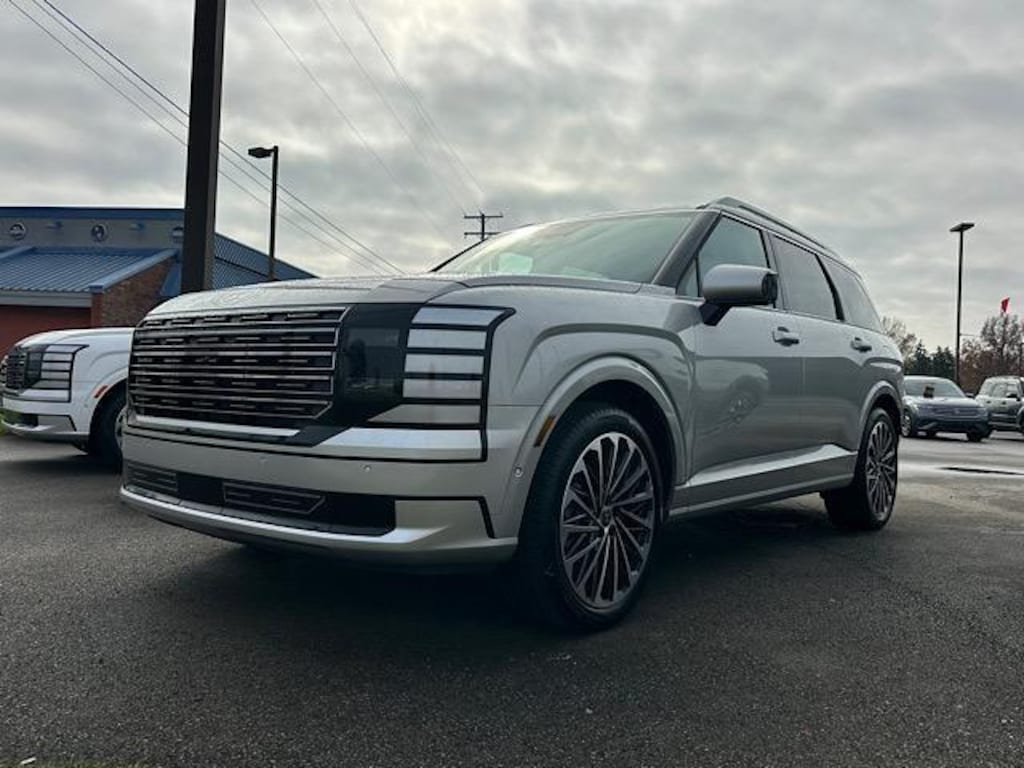 Check out all these great options Option Group 01, 14 Speakers, 3rd row seats: split-bench, 4-Wheel Disc Brakes, ABS brakes, Air Conditioning, Alloy wheels, AM/FM radio: SiriusXM, Apple CarPlay & Android Auto, Audio memory, Auto High-beam Headlights, Auto-dimming door mirrors, Auto-dimming Rear-View mirror, Auto-leveling suspension, Automatic temperature control, Brake assist, Bumpers: body-color, Cargo Cover, Cargo Net, Cargo Tray, Carpeted Floor Mats, Compass, Delay-off headlights, Driver door bin, Driver vanity mirror, Dual front impact airbags, Dual front side impact airbags, Electronic Stability Control, Emergency communication system: Bluelink+, Exterior Parking Camera Rear, Four wheel independent suspension, Front anti-roll bar, Front Bucket Seats, Front Center Armrest, Front dual zone A/C, Front reading lights, Fully automatic headlights, Garage door transmitter: HomeLink, Genuine wood console insert, Genuine wood dashboard insert, Heads-Up Display, Heated & Ventilated Front Bucket Seats, Heated door mirrors, Heated front seats, Heated rear seats, Heated steering wheel, HVAC memory, Illuminated entry, Knee airbag, Leather steering wheel, Low tire pressure warning, Memory seat, Navigation System, Occupant sensing airbag, Outside temperature display, Overhead airbag, Overhead console, Panic alarm, Passenger door bin, Passenger vanity mirror, Power door mirrors, Power driver seat, Power Liftgate, Power moonroof, Power passenger seat, Power steering, Power windows, Premium Nappa Leather Seat Trim, Radio data system, Radio: Infotainment Navigation System, Rain sensing wipers, Rear air conditioning, Rear anti-roll bar, Rear audio controls, Rear reading lights, Rear side impact airbag, Rear window defroster, Rear window wiper, Reclining 3rd row seat, Remote keyless entry, Security system, Speed control, Split folding rear seat, Spoiler, Steering wheel mounted audio controls, Tachometer, Telescoping steering wheel, Tilt steering wheel, Traction control, Trip computer, Turn signal indicator mirrors, Variably intermittent wipers, Ventilated front seats, Ventilated rear seats, and Wheels: 21" x 8.5J Alloy. Typhoon Silver Metallic 2026 Hyundai Palisade Calligraphy AWD 8-Speed Automatic V6